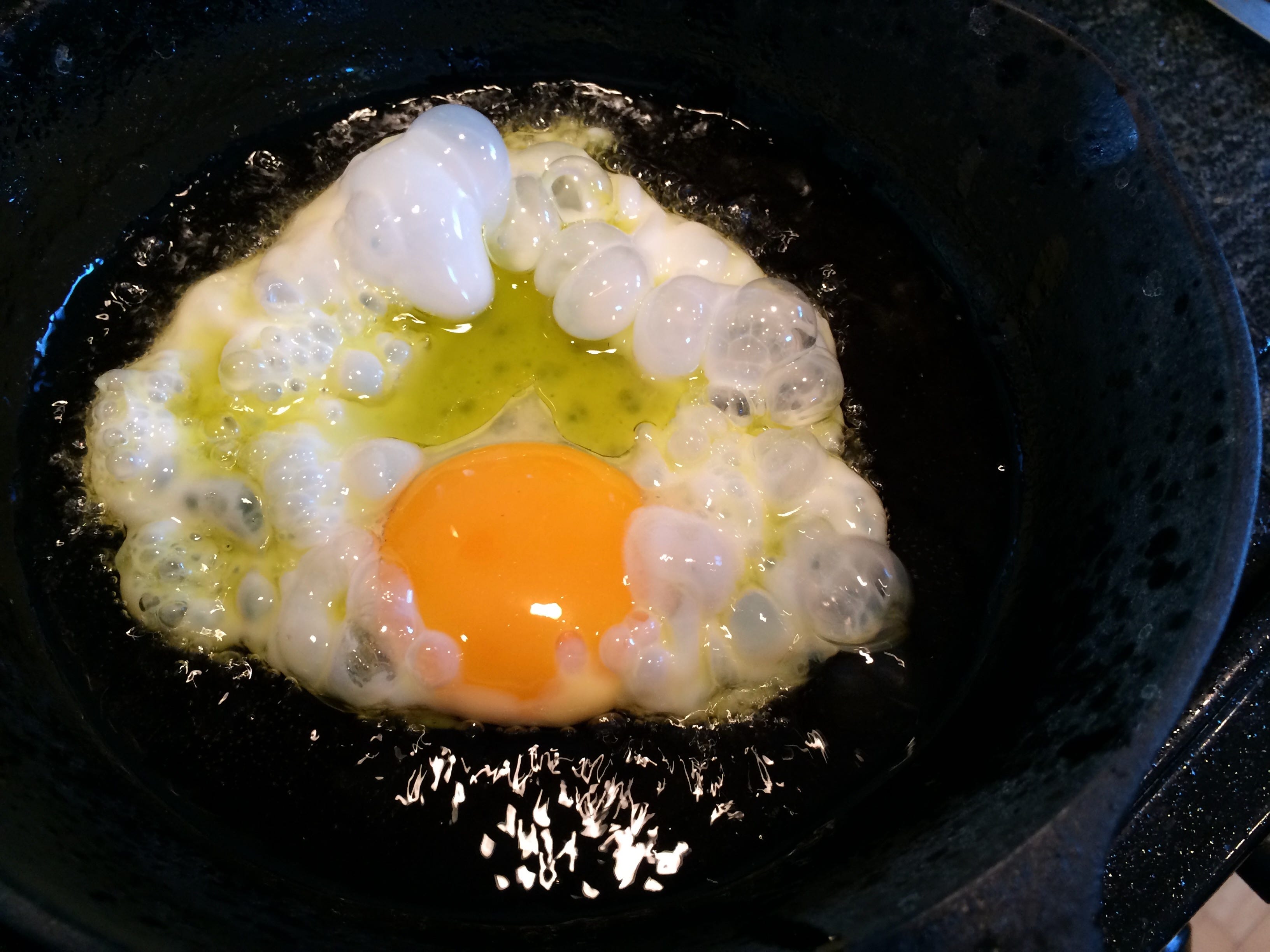 The eggs I fry these days come from a neighbor’s chickens who scratch in the dust and live on a diet enriched with roots, grubs and garden bugs, but even the most ordinary hatchery egg can be transported to aesthetic heights by a bath in very hot olive oil.