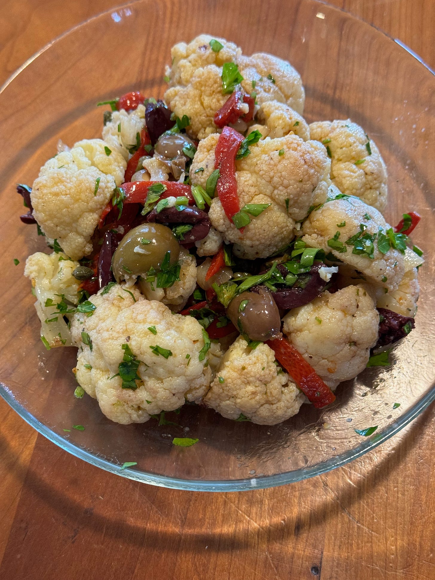 In honor of the olive tree and its bounty, let me offer a seasonal treat, a Christmastime salad from Napoli, called Insalata di Rinforzo or, more simply, Insalata di Cavolfiore, cauliflower salad, which was served to me one year when I happened to be in Naples for Christmas. Like many traditional holiday dishes, this one comes with a story.