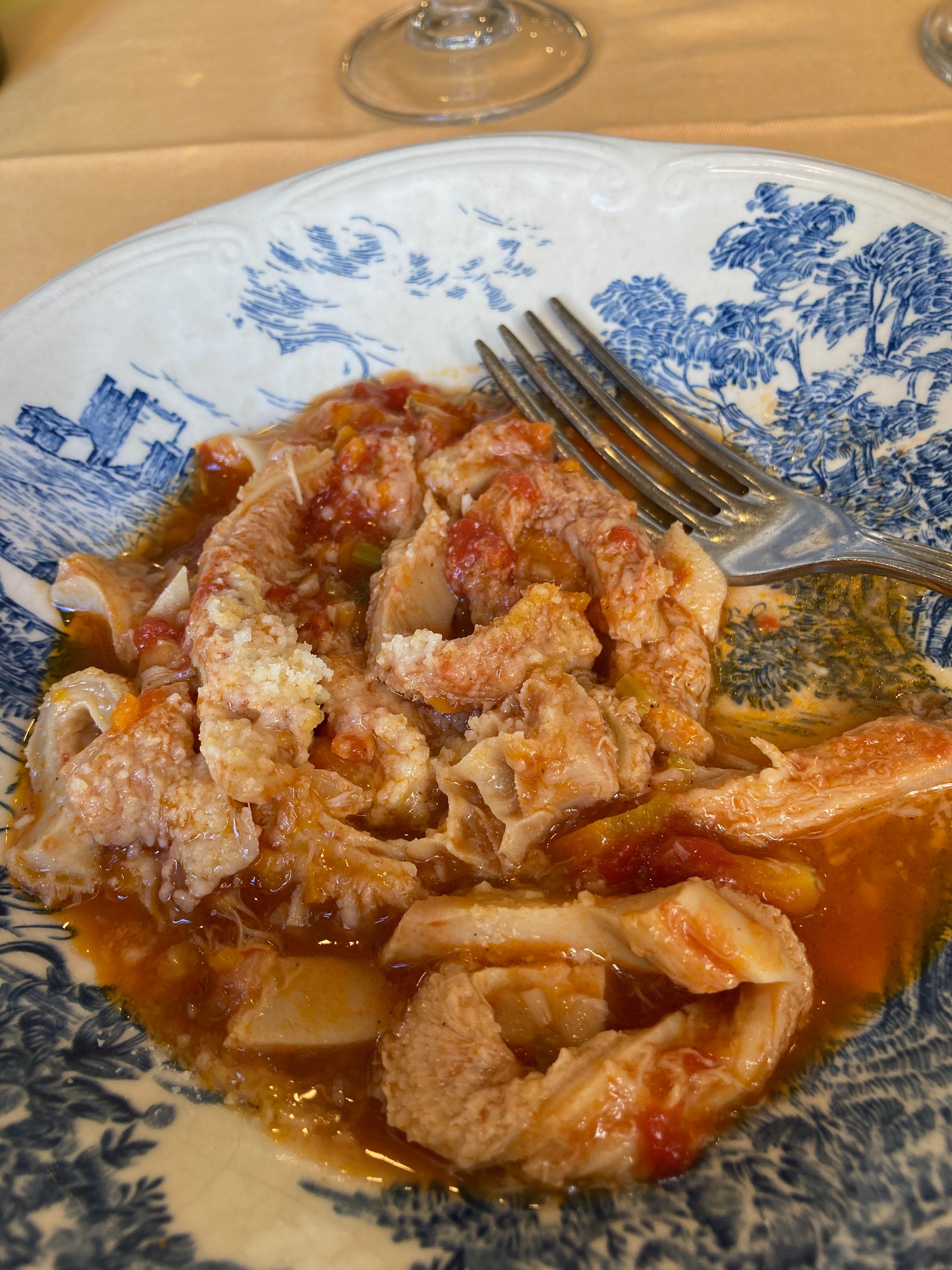 And then away to the south in Montepulciano, at La Grotta, another favorite right across from the magnificent San Biagio church, I was given tripe as an antipasto, served on crostini and topped with very thin shavings of lardo that melted slightly in the heat of the trippa itself. (Alas, I’ve just learned that La Grotta has been sold. It was a treasure of Tuscan traditional cuisine with an urbane verve and style all its own. I shall miss it fiercely.)