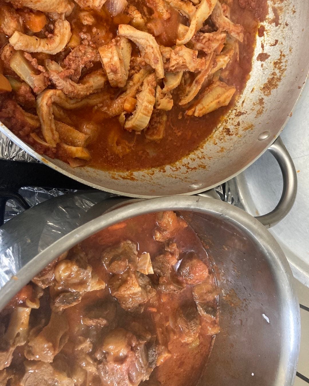 This photograph showed up on my Facebook feed this week, posted by Claudio and Daniela Lunghini, the brother-sister team who together run Minimarket Lunghini in Campaccio, a tiny hamlet below the walls of Cortona. It’s where I shop for fine cheeses, good wines, local meats butchered with commanding authority by Claudio, salumi often made in-house, specialty pastas (brands like Rustichella and Cavalieri that are hard to find in Italy where everyone seems to subsist on Barilla), British teas and Swiss chocolates (the clientele is international), and above all for daily offerings of prepared food, much of which is made in the home kitchen of Mamma Lunghini. This could mean a gossamer-layered lasagna, or chicken roasted with rosemary-flecked potatoes, or hearty, bean-blessed ribollita, or a pork ragù made with locally raised Cinta Senese, the finest kind of pig. Or a tripe or oxtail stew, as above.