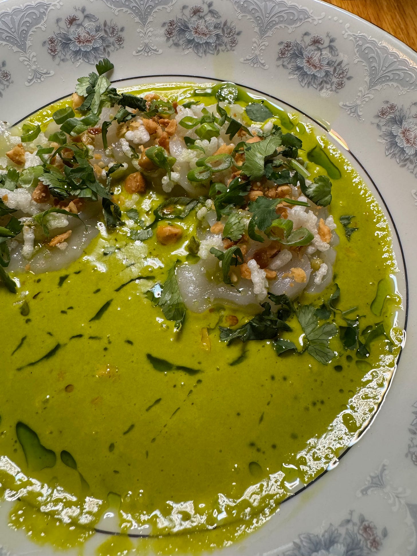 If you can access really fresh scallops (having trouble? you might want to try my friend Togue Brawn’s Dayboat Scallops strictly from Maine), join legions of Maine connoisseurs and serve them up raw, sometimes thinly sliced to make a crudo presentation. They are melt-in-the-mouth delicious, dressed with a thread of exra-virgin, a spritz of lemon, a dash of freshly minced herbs. Or in this more elaborate presentation from my daughter’s restaurant, Nīna June, in Rockport, Maine: