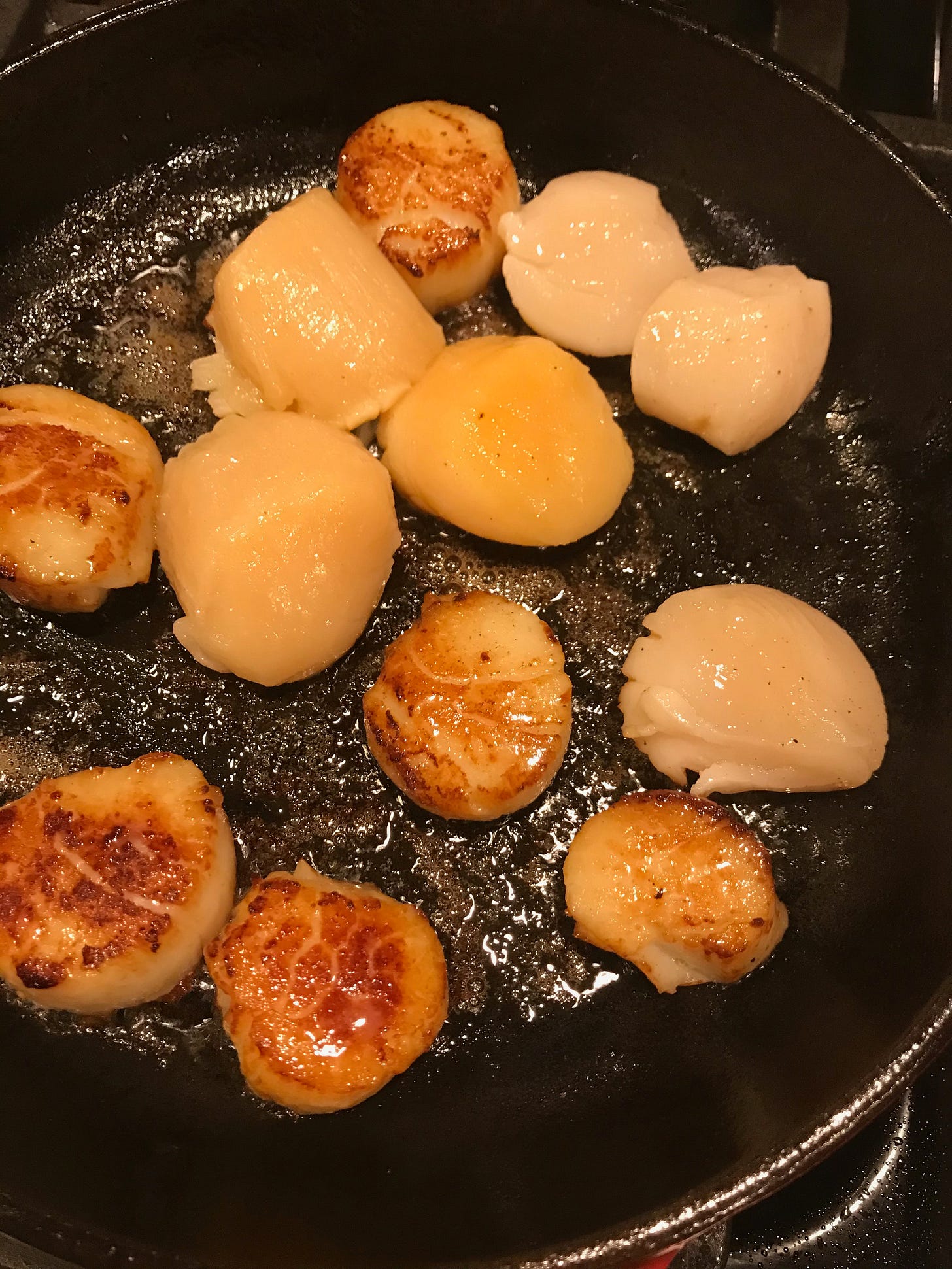 Meanwhile, if you are shopping for scallops there are a few cautions to keep in mind. The most important is to ensure that the scallops are so-called “dry scallops,” meaning they have not been treated with sodium tripolyphosphate (STPP), a solution that bleaches the scallops and lets them plump by absorbing water. Apart from an unwelcome chemical addition (although the FDA certifies STPP as GRAS—Generally Regarded as Safe), this means that you cannot sear or brown the scallops in your black iron skillet or any other pan you happen to have because they will exude all that water and boil rather than sear. And I do believe that searing scallops is the quickest, easiest, and tastiest way to prepare them. Any fish monger should be able to tell you whether or not the scallops have been treated.